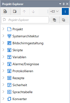 Navigieren Sie im [Projekt-Explorer] durch Projektbereiche wie Bildschirme, Variablen, Alarme, Zieleinstellungen, Geräte usw.