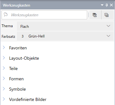Der [Werkzeugkasten] ist ein kontextbasiertes Fenster, in dem Sie Objekte und Bausteine, die Sie Ihrem Projekt hinzufügen möchten, auswählen können.