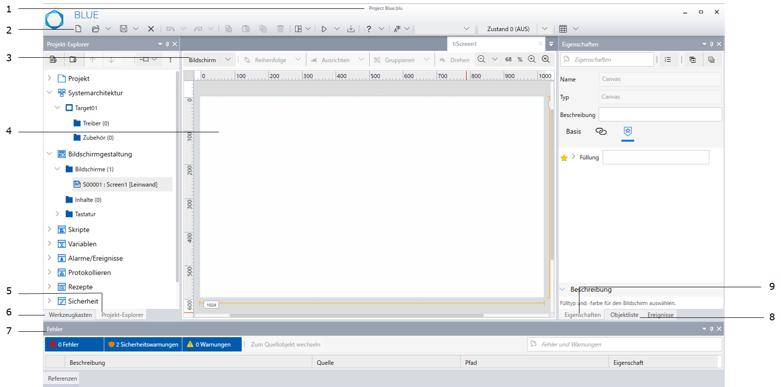| 5 | [Projekt-Explorer] | Das ist der Startpunkt zur Erstellung eines Projekts. Von dieser Ansicht können Sie zu Projektelementen wie Bildschirmen, Variablen, Alarmen, Plattformeinstellungen und Geräten navigieren. |