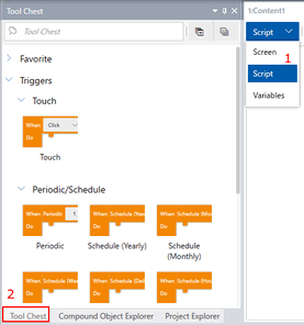 Richten Sie ein Script ein, das die Eigenschaft [Sichtbarkeit] anderer Inhaltsanzeige-Objekte zwischen 0 (anzeigen) und 2 (minimieren) umschaltet, wenn ein Schalter auf einem der Inhaltsanzeige-Objekte berührt wird.