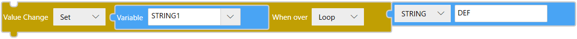 Baustein![]() TextchangeValue($Enums.WhenOver.Loop, $Enums.AssignmentOperator.AddTo, STRING1, "DEF"); |