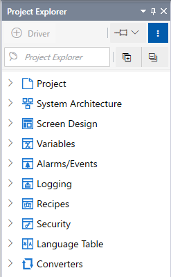 From the [Project Explorer], navigate areas in the project such as screens, variables, alarms, target settings, equipment, and so on.