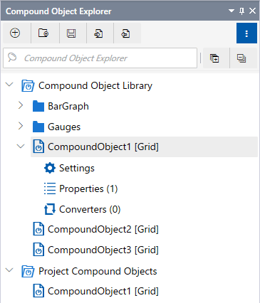 Use the Compound Object Explorer to add/open/import/export compound objects from [Compound Object Library] node to their configure compound object properties and other settings. Create folders to organize compound objects into groups. The Compound Object Explorer displays the Compound Object Library from which compound objects can be used across multiple projects as well as displays project specific project compound objects. The [Compound Object Library] node is always visible as it does not depend on the Project status. Compound objects that are related to a project [Project Compound Objects] node are visible only if the Project is open.