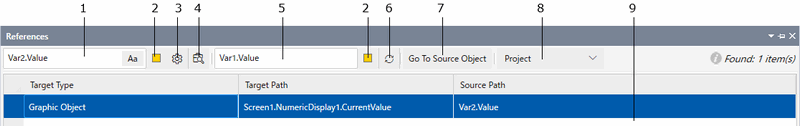 Using the [References] window, you can search for instances of a specified source property or text in the project or compound objects. You can then use the [References] window to replace the source property or text.