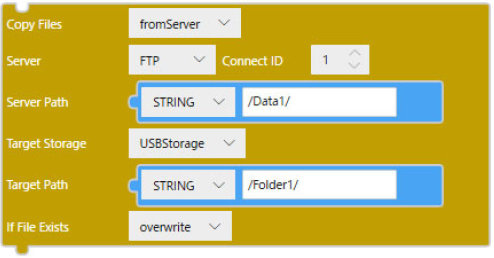 'copyFilesFromServer($Enums.Server.FTP, 1, "/Data1/", $Enums.Storage.USBStorage, "/Folder1/", $Enums.FileConflictAction.Overwrite);'