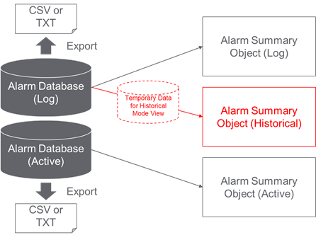 El objeto del resumen de alarmas muestra los datos de las alarmas directamente desde la base de datos de alarmas (registro) o la base de datos de alarmas (activo).