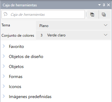 Cuando el Editor de pantalla está abierto, puede arrastrar y soltar objetos de la [Caja de herramientas] a la pantalla. Los objetos se clasifican como: [Objetos], [Formas], [Imágenes predefinidas] y [Objetos de diseño]. Hay una categoría adicional que enumera cualquier objeto agregado como [Favorito].