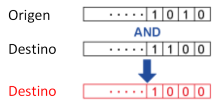 | [AND] | Ejecuta una operación AND (AND a nivel de bit) entre el entero o la propiedad de origen que se ha especificado en el [Origen] con la propiedad de origen especificada en el campo [Destino], luego copia el resultado en la propiedad de origen de destino. ![]() |