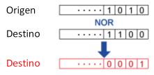 | [NOR] | Escribe el valor NOR (suma lógica seguida del convertidor) del entero o propiedad de origen que se ha especificado en [Origen] y la propiedad de origen especificada en el [Destino] y copia el resultado en la propiedad de origen de destino. ![]() |