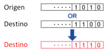 | [OR] | Escribe el valor OR (suma lógica) del entero o propiedad de origen que se ha especificado en el [Origen] y la propiedad de origen especificada en el [Destino] y copia el resultado en la propiedad de origen de destino. ![]() |