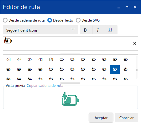 Defina cómo se diseña el objeto de ruta. Seleccione [Desde cadena de ruta] o [Desde Texto]. La cadena de ruta se borra al cambiar de [Editor de ruta] de [Desde cadena de ruta] a [Desde Texto]. Al cambiar de [Desde texto] a [Desde cadena de ruta], la cadena de ruta se construye en base al texto. |
