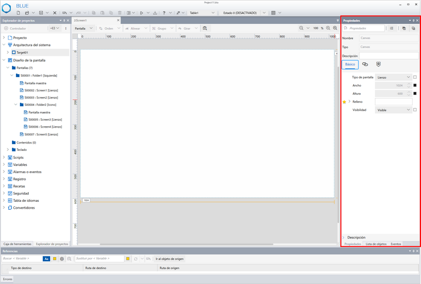 En la ventana Propiedades, configure los elementos seleccionados en el [Explorador de proyectos], las pantallas y las propiedades de los objetos colocados en las pantallas.