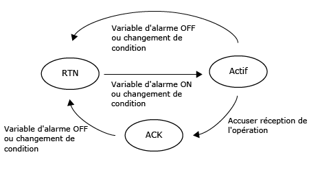 Selon le réglage de la propriété [Comportement de l'alarme], le statut de l'alarme passe de trois états ([ACQ optionnel]) à quatre états ([ACQ obligatoire]).