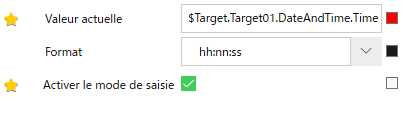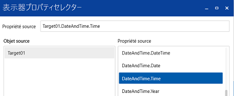 À titre d'exemple de liaison de données, une propriété Affichage de la date/heure [Valeur actuelle] est associée à une propriété qui contient la date/l'heure de l'afficheur. Dans ce cas, la propriété [Valeur actuelle] est la cible de liaison et la propriété contenant la date et l'heure est la source de liaison.