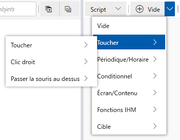 Pour créer un script qui est déclenché par un objet sur un écran, ouvrez l'écran, sélectionnez l'objet et la fenêtre [Événements] répertorie les déclencheurs disponibles pour l'objet. Cliquez sur [+] pour ajouter le déclencheur associé dans une nouvelle section de script.