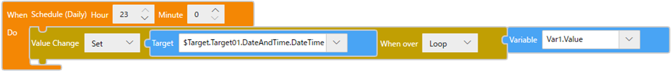 Bloc![]() TexteonScheduledDay(23, 0, () => { changeValue($Enums.WhenOver.Loop, $Enums.AssignmentOperator.Set, $Target.Target01.DateAndTime.DateTime, Var1.Value); }); |