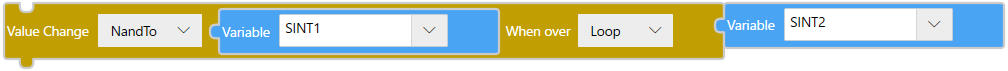 Bloc![]() TextechangeValue($Enums.WhenOver.Loop, $Enums.AssignmentOperator.NandTo, SINT1, SINT2); |