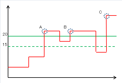 Se reporter au tableau suivant : Au point A, la valeur d'entrée dépasse 20 pour la première fois, donc le déclenchement se produit. Au point B, la valeur d'entrée ne diminue pas au-dessous de 15, donc le déclenchement ne se produit pas. Au point C, la valeur d'entrée diminue au-dessous de 15 et augmente au-dessus de 20, donc le déclenchement se produit.