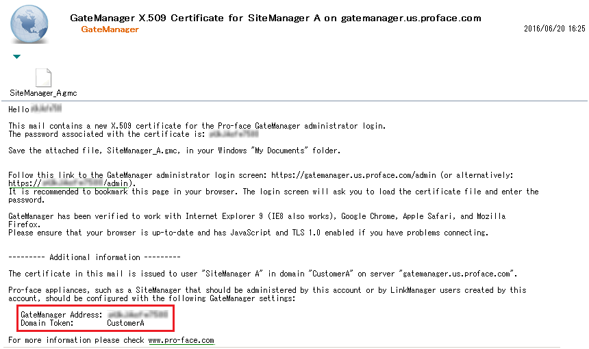 Le informazioni richieste in questa schermata si trovano nella sezione inferiore dell’e-mail ricevuta da GateManagercon il certificato GateManager X.509 Certificate.