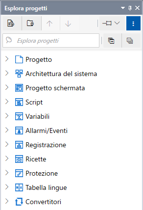 Da [Esplora progetti], navigare tra le aree del progetto come schermi, variabili, allarmi, impostazioni del target, apparecchiature e così via.