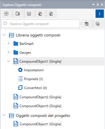 Utilizzare l'Esplora oggetti composti per aggiungere/aprire/importare/esportare oggetti composti dal nodo [Libreria oggetti composti] e configurare le proprietà degli oggetti composti e altre impostazioni. Creare cartelle per organizzare gli oggetti composti in gruppi. L'Esplora oggetti composti visualizza la Libreria oggetti composti da cui è possibile utilizzare gli oggetti composti in più progetti e visualizza gli oggetti composti specifici del progetto. Il nodo [Libreria oggetti composti] è sempre visibile, perché non dipende dallo stato del progetto. Gli oggetti composti relativi al nodo [Oggetti composti del progetto] del progetto sono visibili solo se il progetto è aperto.