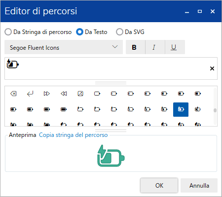 Per aprire [Editor di percorsi], cliccare l'icona . Progettare l'oggetto Percorso utilizzando la stringa o il testo del percorso. |