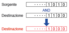 | [AND] | Esegue l’operazione AND (AND bit per bit) tra l’intero o la proprietà della sorgente specificata in [Sorgente] con la proprietà della sorgente specificata nel campo [Destinazione] e poi copia il risultato nella proprietà di della sorgente di destinazione. ![]() |