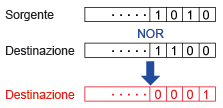| [NOR] | Scrive il valore NOR (somma logica seguita da inverter) del numero intero o della proprietà della sorgente specificata nella [Sorgente] e la proprietà della sorgente specificata nella [Destinazione] e copia il risultato nella proprietà della sorgente di destinazione. ![]() |