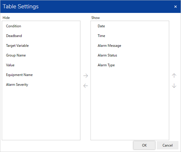アラーム表示器オブジェクトには、アラームデータベース (ログ) またはアラームデータベース (アクティブ) のアラームデータが直接表示されます。
