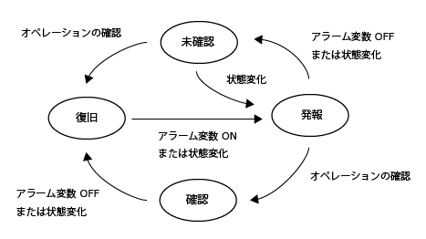 アラームステータスは [アラーム動作] プロパティの設定により状態数 3 ([任意確認]) または状態数 4 ([必須確認]) で遷移します。