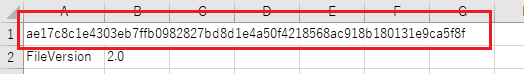 [操作ログ] のプロパティウィンドウで、[データのエクスポート] の [変更の検出] を有効にすると、エクスポートファイルの最初の行に英数字の文字列が追加されます。この英数字の文字列は、Export File Validation Tool でファイルデータの変更を検出するために使用されます。このツールを使用する場合は、英数字の文字列を削除または変更しないでください。