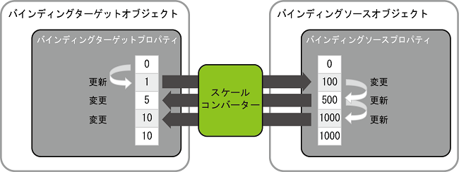 コンバーターを使用すると、バインディングソースの値を任意の規則に従ってバインディングターゲットに反映させるように変換できます。例えば、バインディングソースの値を 1/100 に変換するスケールコンバーターを使用した場合、バインディングソースに 500 を入力すると、バインディングターゲットは 5 を示します。