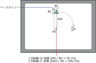 [回転軸 (X座標)] = 50、[回転軸 (Y座標)] = 500 の場合、回転軸は以下のようになります。