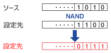 | [NAND] | [ソース] で指定した整数またはソースプロパティと、[設定先] で指定したソースプロパティの間で NAND 演算 (否定論理積) を実行し、結果を設定先のソースプロパティにコピーします。 ![]() |