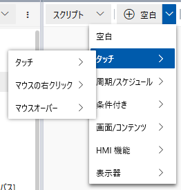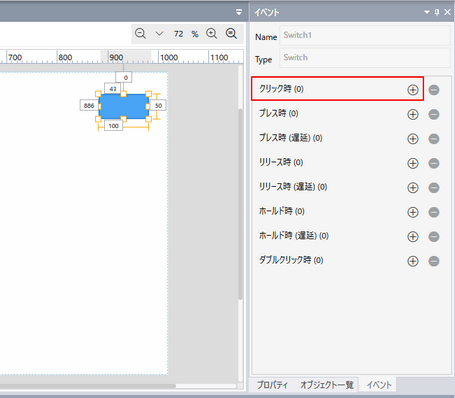 画面のオブジェクトによってトリガーされるスクリプトを作成する場合、画面を開いてオブジェクトを選択すると、[イベント] ウィンドウにそのオブジェクトで使用可能なトリガーの一覧が表示されます。[+] をクリックすると、新しいスクリプトセクションにそのトリガーが追加されます。