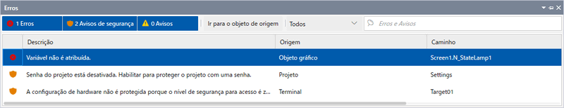 Mensagem de aviso exibida quando o projeto contém uma configuração não segura. Mesmo que este tipo de mensagem permaneça no projeto, você pode executar transferências ou simulação do projeto. No entanto, a menos que você tenha uma razão específica para manter uma configuração não segura, recomendamos resolver esta mensagem de aviso. |