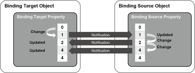 Vinculação de dados permite que você escolha a direção na qual os valores de propriedade são refletidos entre o Destino de vinculação e a Origem de vinculação.