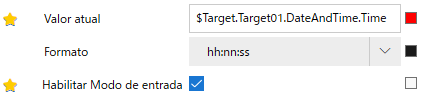 Como um exemplo de Vinculação de dados, uma propriedade de Exibição de data/hora [Valor atual] está associada a uma propriedade que contém a data/hora da unidade do display. Neste caso, a propriedade [Valor atual] é o Destino de vinculação e a propriedade que contém a data e a hora é a Origem de vinculação.