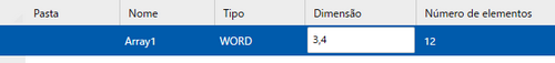 Na janela [Explorador de projeto], em [Variáveis] → [Todos os tipos de dados de usuário] → [Matrizes], na coluna [Dimensão], defina a dimensão da matriz e o número de elementos.