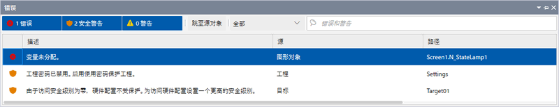 当工程包含不安全的设置时显示的警告消息。即使此类消息保留在工程中,您也可以执行工程传输或模拟。但是,除非您有特定的原因保留不安全的设置,否则我们建议您解决此警告消息。 |