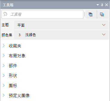 当屏幕编辑器打开时,您可以从 [工具箱] 将对象拖放到屏幕上。对象被分类为: [部件]、[形状]、[预定义图像] 和 [布局对象]。还有一个附加的类别,它列出了所有添加到 [收藏夹] 的对象。