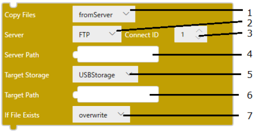 'copyFilesFromServer($Enums.Server.FTP, 1, "/Data1/", $Enums.Storage.USBStorage, "/Folder1/", $Enums.FileConflictAction.Overwrite);'