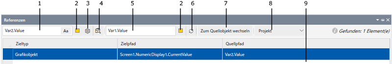 Mit dem Fenster [Referenzen] können Sie nach Instanzen einer angegeben Quelleigenschaft oder nach einem Text im Projekt oder Verbundobjekt suchen. Im Fenster [Referenzen] lässt sich dann die Quelleigenschaft oder der Text ersetzen.