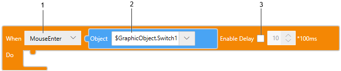 Die Operation wird ausgelöst, wenn die Maus über das Zielobjekt auf dem Bildschirm bewegt wird. Sie können eine Verzögerungszeit zwischen dem Zeitpunkt des Auslösens per [Mouse Enter] und dem Ausführen des definierten Vorgangs einstellen. BausteinAktivieren Sie das Kontrollkästchen zu [Enable Delay], um eine Verzögerungszeit festzulegen. TextUm eine Verzögerungszeit (z. B. 10*100 ms) im Textmodus einzustellen, verwenden Sie onMouseEnterWithDelay($GraphicObject.Switch1, 10, ()=>{ Sie können auch folgendermaßen einen [Mouse Enter]-Auslöser ausführen: