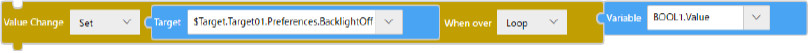 Baustein![]() TextchangeValue($Enums.WhenOver.Loop, $Enums.AssignmentOperator.Set, $Target.Target01.Preferences.BacklightOff, BOOL1.Value); |