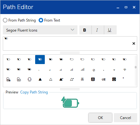 Define how the path object is designed. Select either [From Path String] or [From Text]. The path string is erased when you change the [Path Editor] from [From Path String] to [From Text]. When you change from [From Text] to [From Path String], the path string is constructed based on the text. |