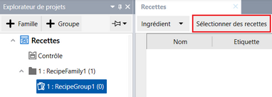 Pour configurer des valeurs de recette pour les ingrédients, dans l'affichage du document, cliquez sur [Sélectionner des recettes] ➞