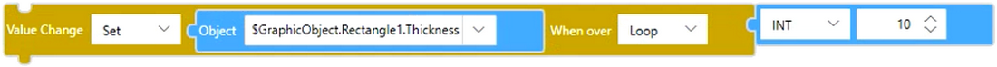 BlocTextechangeValue($Enums.WhenOver.Loop, $Enums.AssignmentOperator.Set, $GraphicObject.Rectangle1.Thickness, 10); |