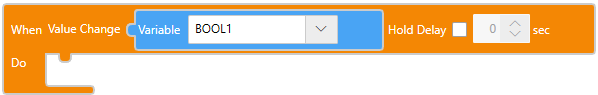 TexteonValueChange(BOOL1,()=>{ }); Hold Delay Après un changement de valeur et le temps spécifié s'est écoulé, l'opération est exécutée. BlocCochez la case pour définir un temps de retard. TextePour définir un délai (par exemple, 10 secondes) en mode Texte, utilisez onValueChangeWithDelay(BOOL1, 10, ()=>{ }); |