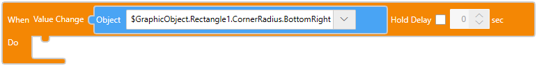 TexteonValueChange($GraphicObject.Rectangle1.CornerRadius.BottomRight,()=>{ }); Hold Delay Après un changement de valeur et le temps spécifié s'est écoulé, l'opération est exécutée. BlocCochez la case pour définir un temps de retard. TextePour définir un délai (par exemple, 10 secondes) en mode Texte, utilisez onValueChangeWithDelay($GraphicObject.Rectangle1.CornerRadius.BottomRight, 10, ()=>{ }); |